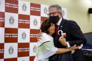 Em seguida, o esposo da empossada, Donato Marinho Neto, junto com o ministro do Superior Tribunal de Justiça e irmão da nova desembargadora, Mauro Campbell Marques, fizeram a troca simbólica da toga do Ministério Público – instituição de origem de nova magistrada – pela do Tribunal de Justiça do Amazonas.