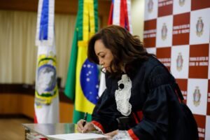 Em seguida, após a leitura do termo de posse pelo secretário-geral de Justiça, Carlos André Vieira, Vânia Marinho prestou o compromisso legal e assinou o termo de posse como desembargadora do TJAM.