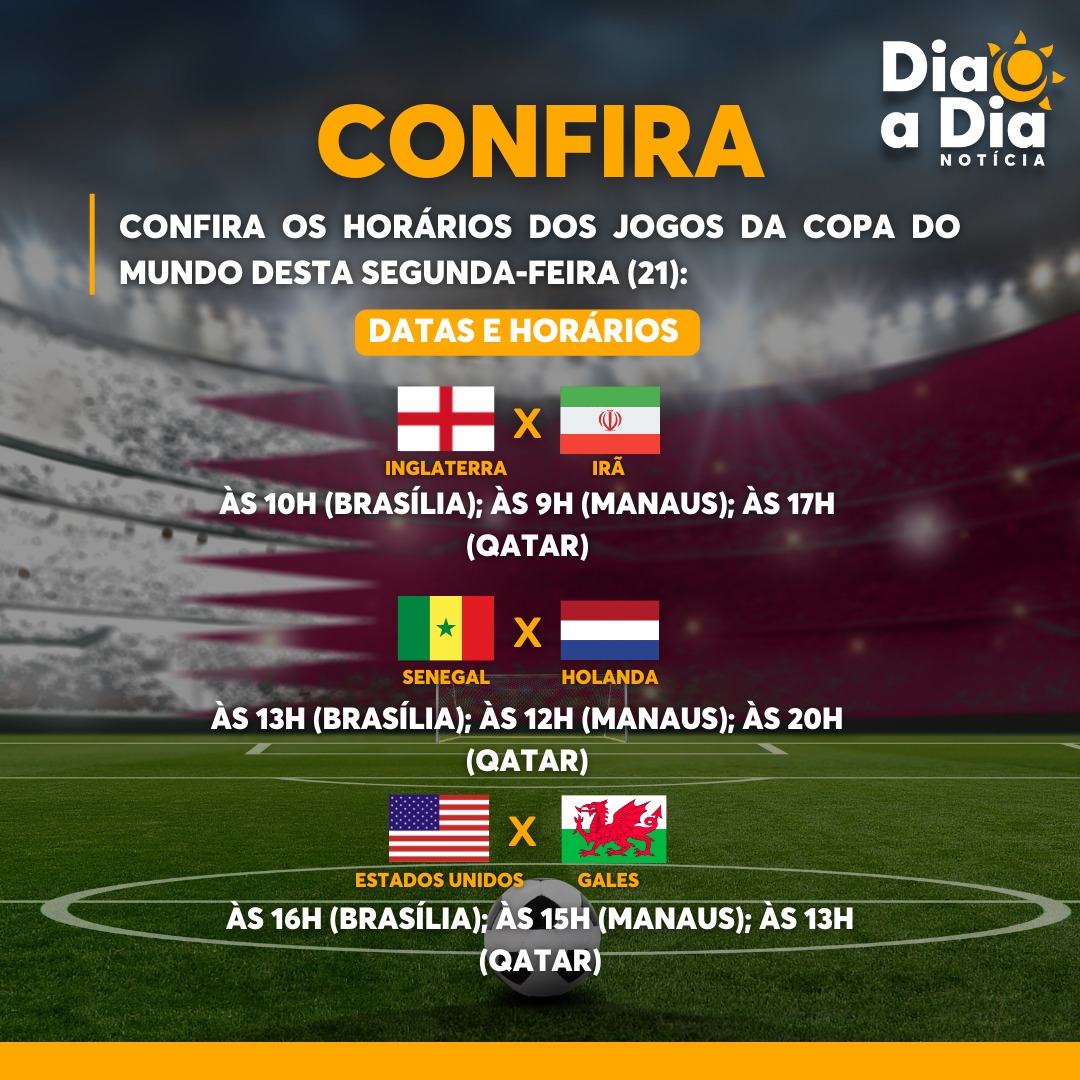 O segundo dia da Copa do Mundo do Qatar será marcado por três jogos nesta segunda-feira (21), são eles: Inglaterra x Irã; Senegal x Holanda; e Estados Unidos x Gales.