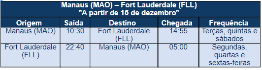 A Azul iniciou nesta quinta-feira (22) a venda de passagens do voo que ligará a capital Manaus a Fort Lauderdale, na Flórida, a partir de 15 de dezembro. Os voos serão realizados três vezes por semana nos dois sentidos e operados por aeronaves A320neo, com capacidade para transportar até 174 Clientes.