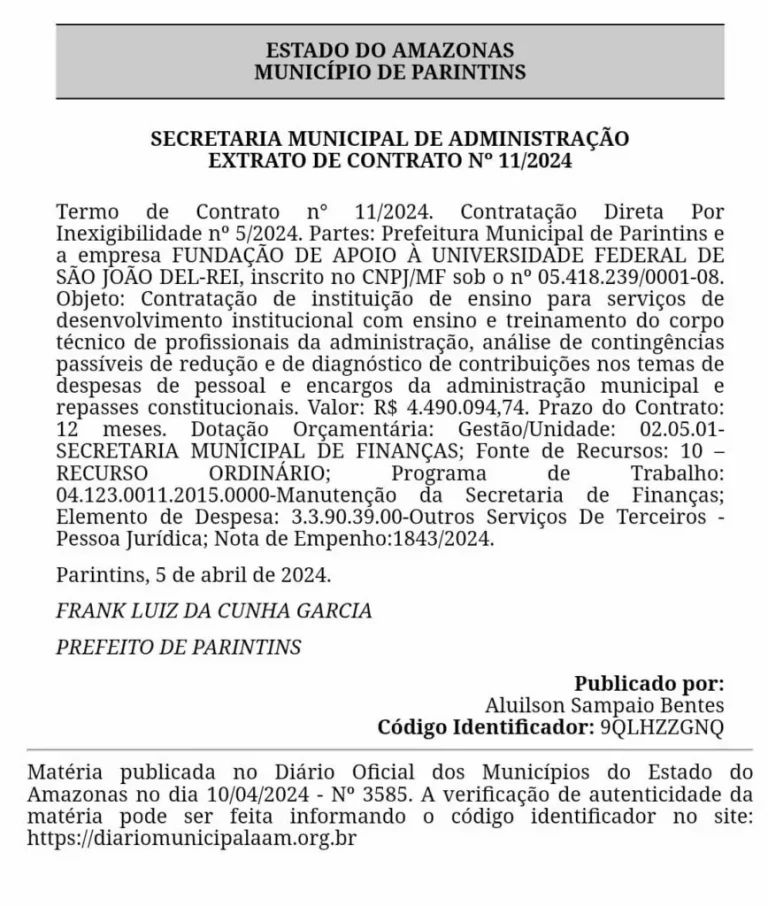 O documento foi assinado no dia 5 de abril e publicado no Diário Oficial dos Municípios no dia 10 de abril. O valor global do contrato é de R$ 4.490.094,74.