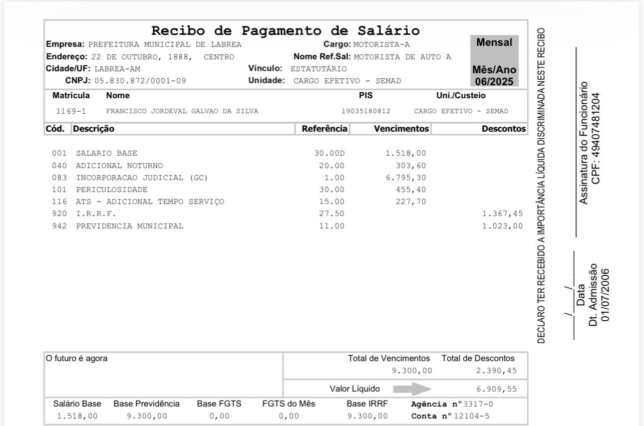 De acordo com informações apuradas, dois vereadores que também são servidores efetivos da Prefeitura de Lábrea estão entre os casos analisados. Contracheques referentes ao mês de junho de 2025, obtidos com exclusividade, mostram que ambos recebem valores incorporados referentes a funções gratificadas — prática que está sendo revista judicialmente após ação movida pelo Executivo Municipal.