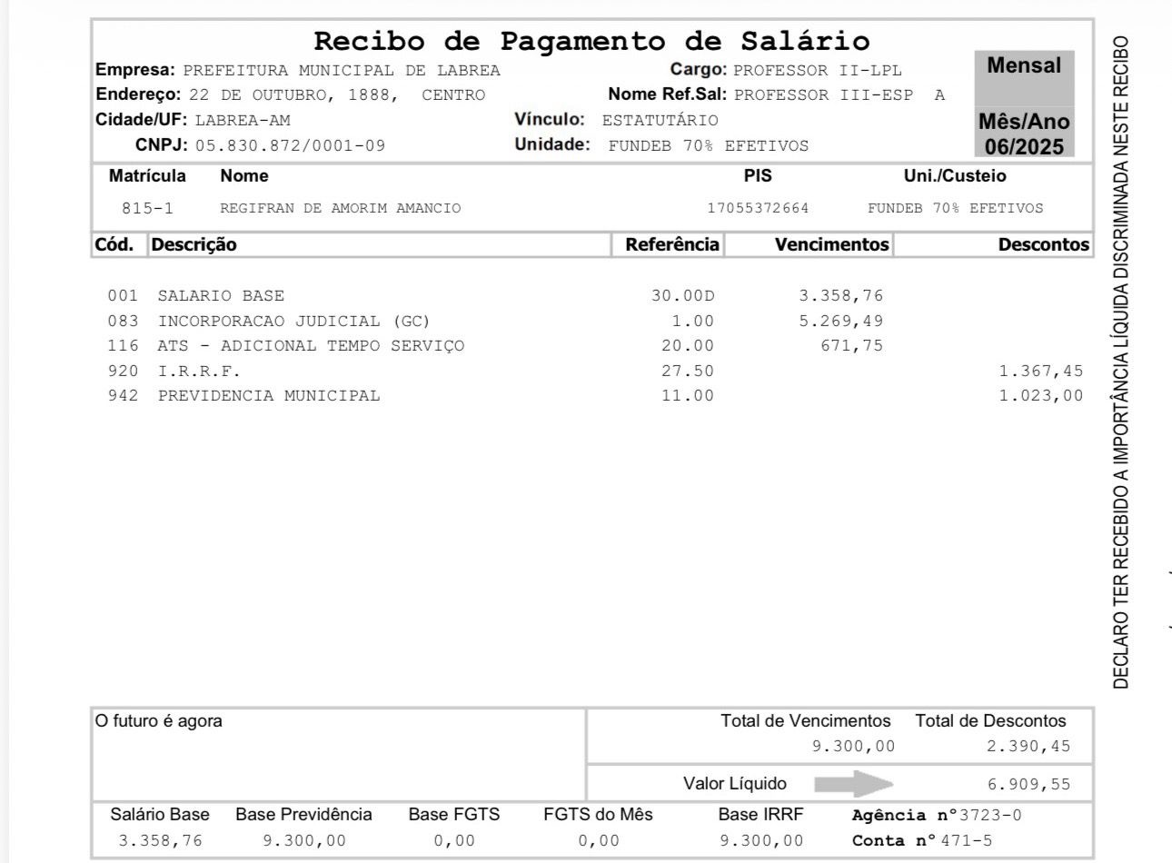 Ainda no mesmo levantamento, o vereador Regifran de Amorim Amâncio, professor efetivo da rede municipal de ensino, aparece com remuneração idêntica, também no valor total de R$ 9.300,00, composta por salário base e uma incorporação judicial (GC) de R$ 5.269,49, além de adicional por tempo de serviço.