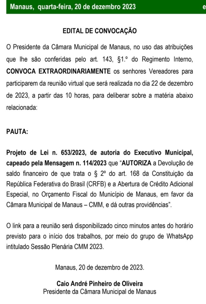 A Câmara Municipal de Manaus (CMM) convocou os vereadores para realizar nesta sexta-feira (22), sessão extraordinária, sem reembolso, para votação de duodécimos e concessão de crédito adicional à Casa Legislativa por meio do próprio Orçamento Fiscal de Manaus.
