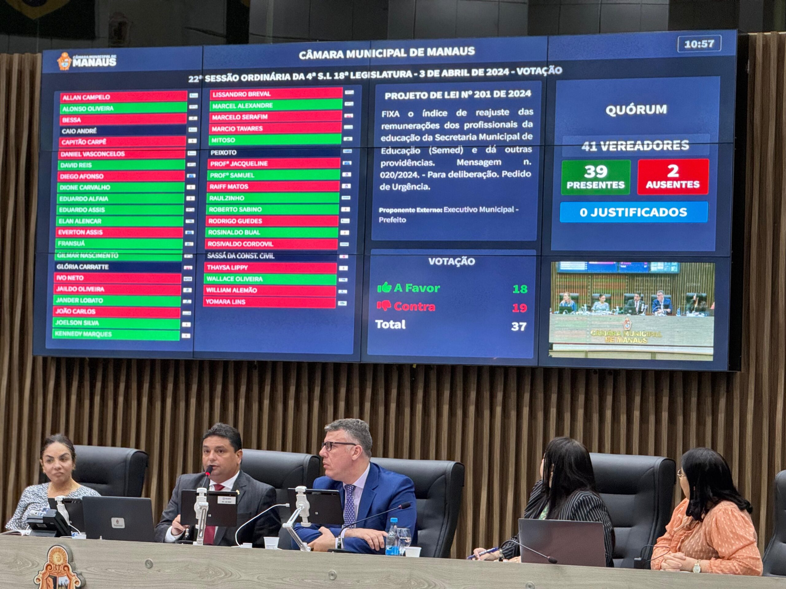 Por 19 votos a 18, os vereadores da Câmara Municipal de Manaus (CMM) rejeitaram o pedido de urgência para a discussão e votação do projeto, de autoria do Executivo Municipal, sobre o reajuste salarial de 1,25% dos professores da Secretaria Municipal de Educação (Semed). Na manhã desta quarta-feira (3), os profissionais realizaram manifestação em frente à CMM.