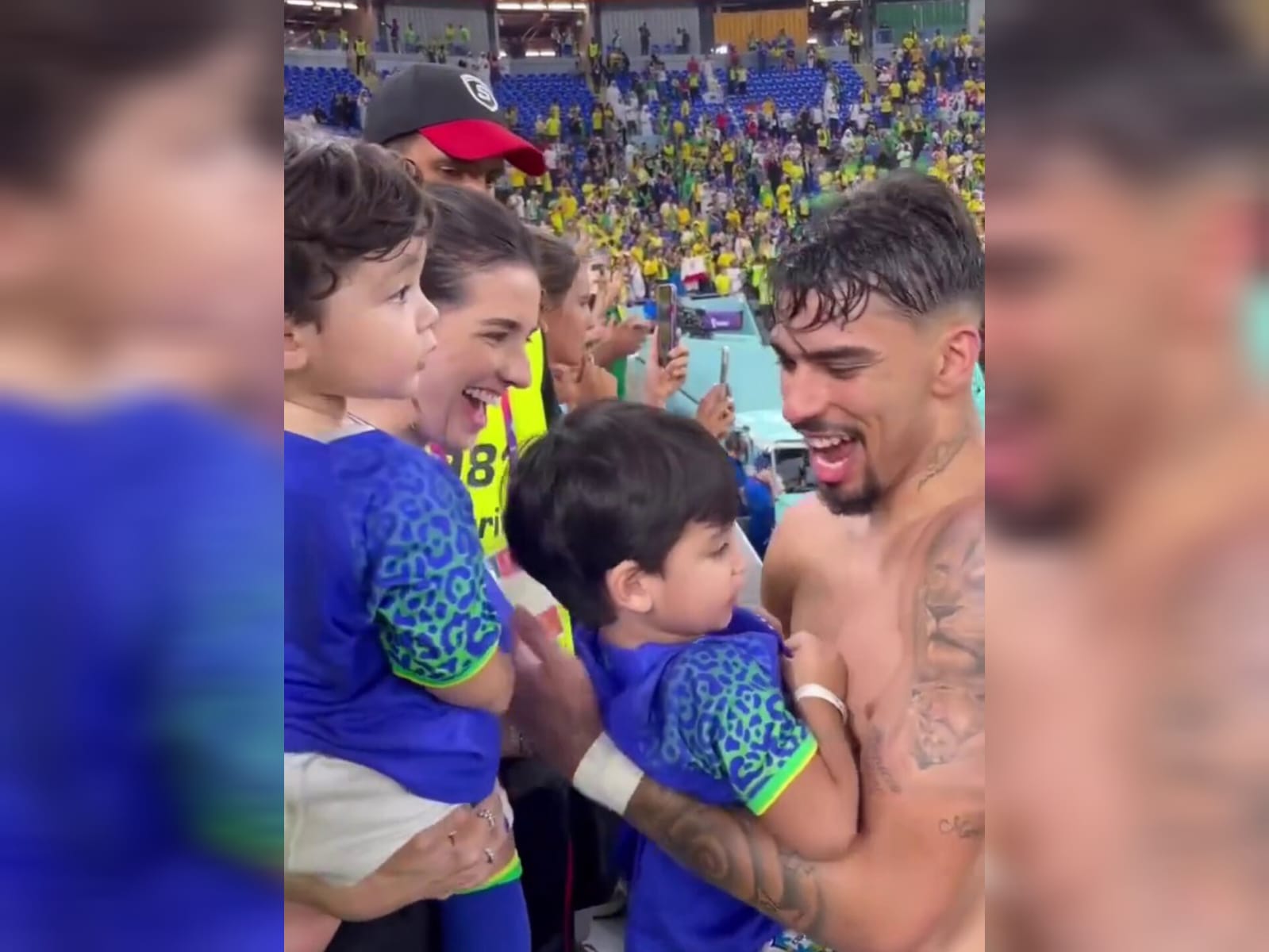 Após a goleada do Brasil contra a Coreia do Sul, o meia da seleção Lucas Paquetá comemorou a vitória ao lado da mulher e dos filhos, que assistiam à partida na arquibancada. Nos vídeo publicado pela esposa do jogador, Maria Eduarda Fournier, Paquetá abraça os filhos e presenteia o mais velho, Benício, com sua camisa da seleção.