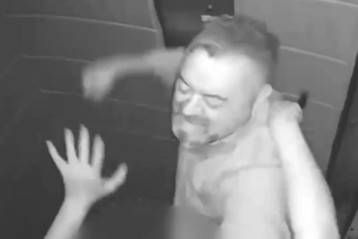 Na sequência, Cleber volta para dentro do elevador, e a mulher entra junto. Em seguida, ele começa a dar socos e cotoveladas no rosto da esposa. O homem espanca a vítima até ela cair.