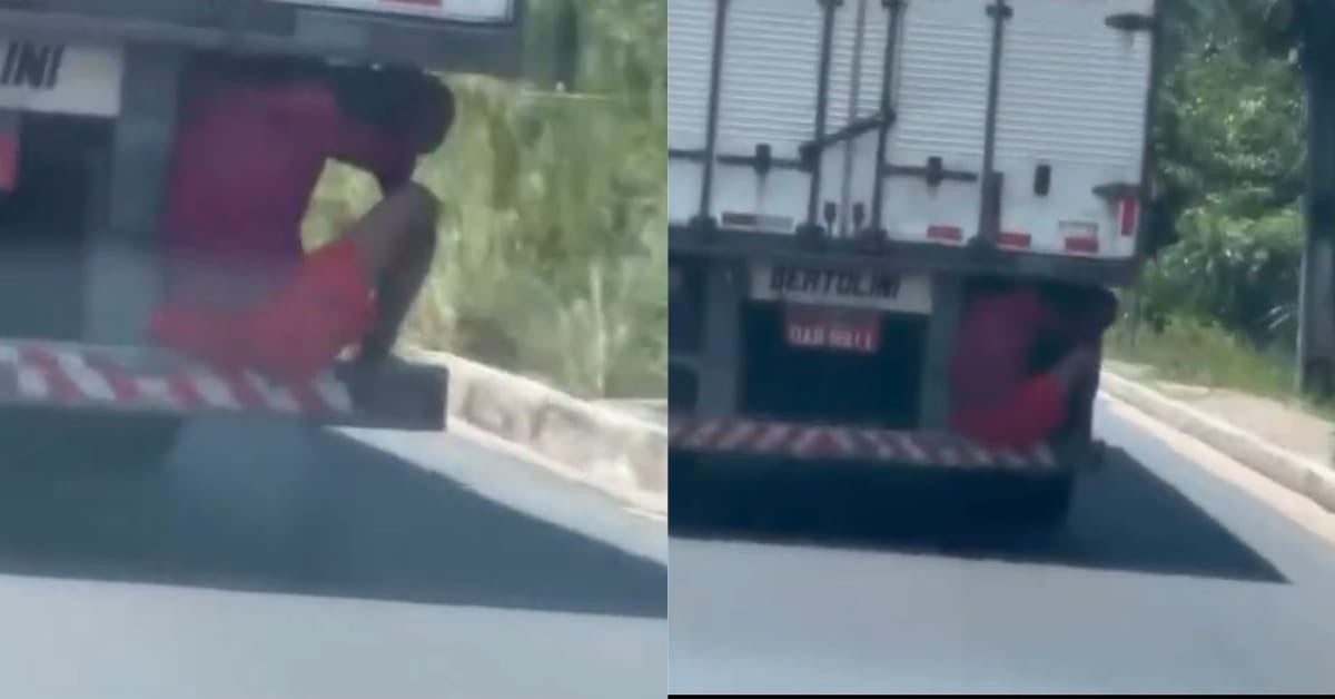 Um vídeo que viralizou nas redes sociais mostra um homem sentado na borda da carroceria de um caminhão baú em movimento, em Manaus. A localização exata e a identidade do homem não foram divulgadas. Nas imagens, o veículo aparece em alta velocidade, aumentando o risco de queda e de acidentes graves.