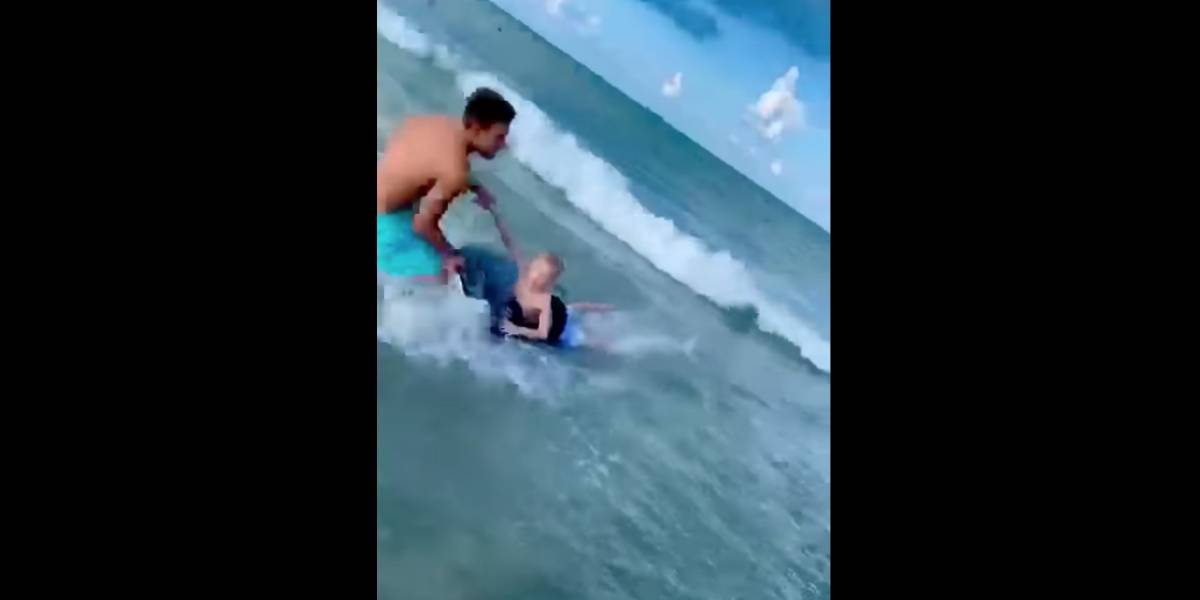 Um vídeo mostra o momento em que um homem puxou um garoto, que brincava no mar, depois que um tubarão foi visto nadando rapidamente em sua direção.