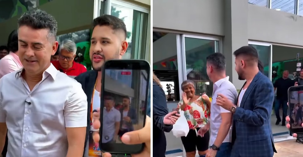 Logo após o contato, ao se afastar e virar de costas, o prefeito levou a mão à boca e fez um gesto que chamou a atenção de quem acompanhava a cena. A atitude foi registrada em vídeo e passou a circular nas redes sociais, onde gerou diferentes interpretações e críticas por parte de internautas.