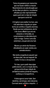 O desabafo acontece após dias de especulações nas redes sociais e na imprensa sobre uma possível crise e o fim do envolvimento entre os dois. Segundo fontes próximas, a relação teria esfriado nas últimas semanas, o que levou Vinícius a refletir sobre suas atitudes.