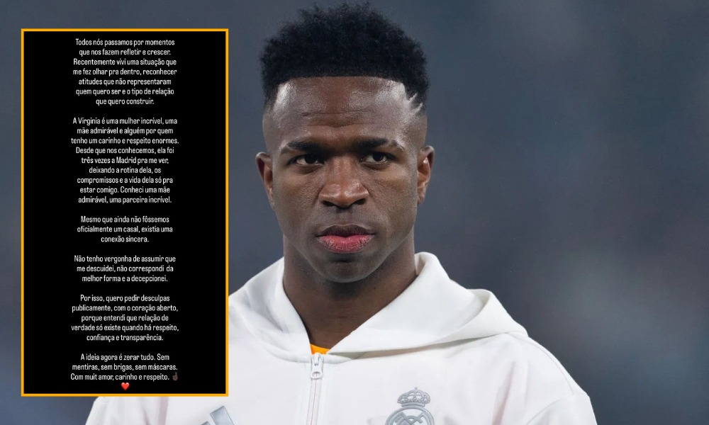 O atacante do Real Madrid, Vinícius Júnior, surpreendeu os seguidores na noite desta terça-feira (8) ao publicar um longo texto em seus stories no Instagram. Na mensagem, o jogador abriu o coração e fez um pedido público de desculpas à influenciadora Virgínia Fonseca, mencionando um envolvimento recente entre os dois.