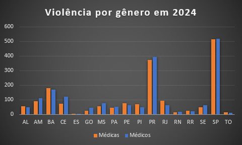 Em oito estados, a quantidade de mulheres agredidas superou a de homens: Acre, Alagoas, Bahia, Pernambuco, Piauí, Rio de Janeiro, Roraima e Tocantins. Ou seja, em 44% das unidades da Federação que informaram os dados sobre sexo (18 no total), a médica foi mais alvo de violência.