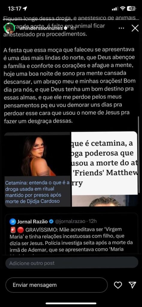 A reflexão do humorista parece estar relacionada às prisões de Ademar Cardoso Neto, 29, e Cleusimar Cardoso, 53, mãe e irmão de Djidja Cardoso. Eles acreditavam ser ‘Jesus’ e ‘Maria’ em uma suposta seita chamada ‘Pai, Mãe, Vida’, que, segundo o inquérito policial, promovia o tráfico de drogas sintéticas de uso veterinário e a administração forçada dessas substâncias. As informações foram base para o mandado de prisão de quatro pessoas envolvidas no caso.