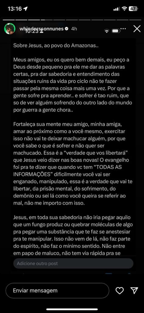 “Jesus, em toda sua sabedoria, não iria pegar aquilo que um fungo produz ou quebrar moléculas de algo para pegar uma substância que te faz se anestesiar para te manipular. Isso não vem de lá, não faz parte do espírito, não faz o mínimo sentido. Não entre em papo de maluco, não tem via rápida para se salvar”, escreveu Whindersson.