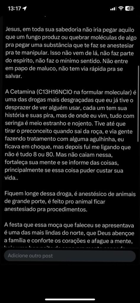 Whindersson Nunes usou suas redes sociais neste sábado (1º) para alertar o ‘Povo do Amazonas’ sobre os perigos do uso de ketamina. O humorista referenciou o caso da ex-sinhazinha do Boi Garantido, Djidja Cardoso, que ganhou repercussão nacional após sua suposta morte devido ao uso excessivo da substância.