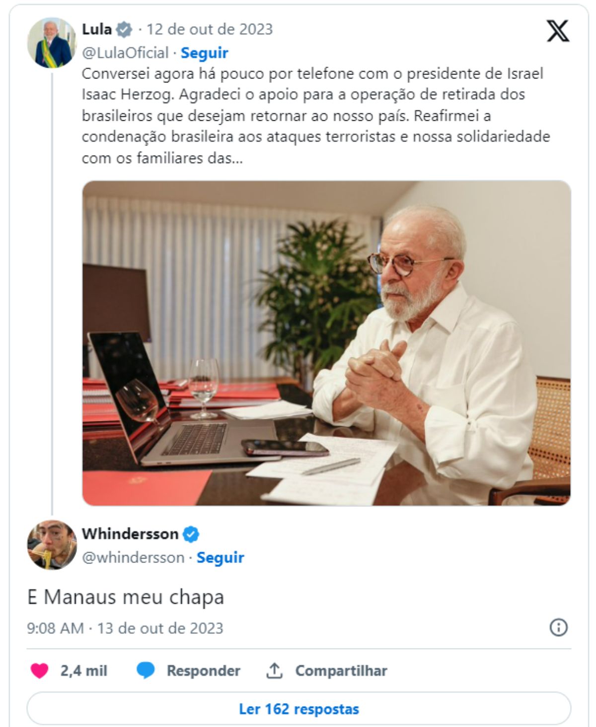 Aparentemente sem acompanhar a fala do presidente, o humorista comentou em uma publicação de Lula sobre Israel: “E Manaus meu chapa?”.