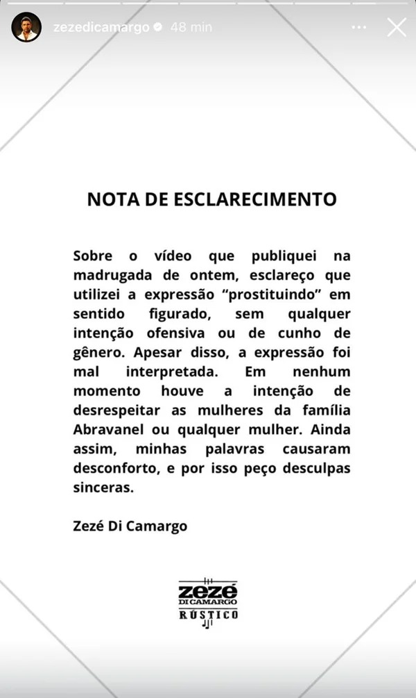 “Sobre o vídeo que publiquei na madrugada de ontem, esclareço que utilizei a expressão ‘prostituindo’ em sentido figurado, sem qualquer intenção ofensiva ou de cunho de gênero”, afirmou o cantor.